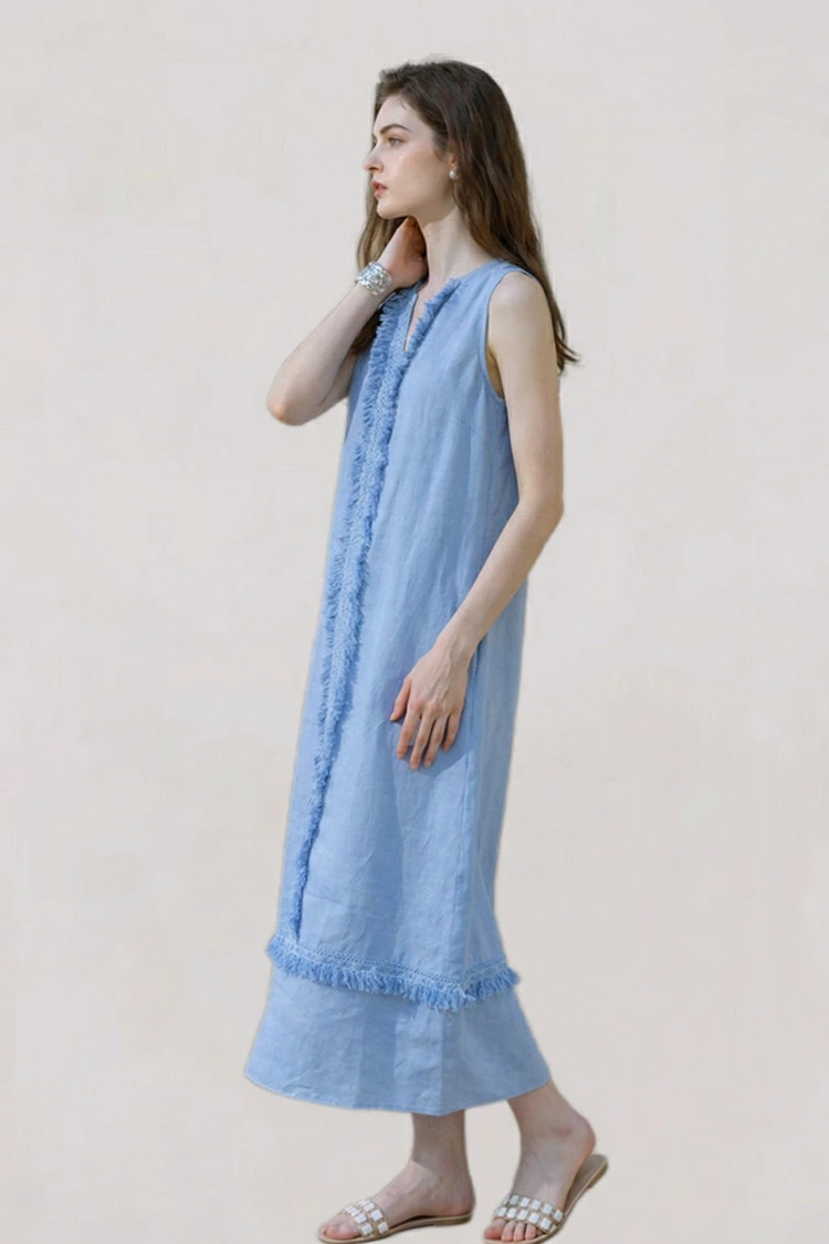 Kesäisten tukkukauppojen keskeisiin vaatimuksiin vastaamiseksi tyylikäs naisten pellava maxi-mekko on muotoiltu väljästi, mikä tasapainottaa mukavuuden ja kattavuuden. Se sopii eri vartalotyypeille, olipa se sitten hoikka tai hieman pullea, ja sitä voi käyttää helposti kaikki. Tämä laajentaa merkittävästi myynnin kohdeyleisöä ja lisää ostojen sijoitetun pääoman tuottoa. Hihaton V-pääntie on virkistävä ja siisti, sopii kuumaan kesäsään. Samalla V-pääntie voi muokata taitavasti olkapään ja kaulan linjoja, pidentäen kaulan mittasuhteita ja korostaa naisten naisellista viehätystä. Pitkän mekon suunnittelussa on hyvä draperointivaikutus, luonnollisesti olkapäiltä putoava, peittää tehokkaasti ylimääräisen rasvan vyötäröllä, lantiolla ja jaloissa minimoiden figuurin puutteet. Kävellessä se on siro ja elegantti tunne ja vahva tunnelma. Tämä pitkä mekko sopii erilaisiin kesäskenaarioihin. Sitä voidaan käyttää yksinään luomaan ranskalainen rento tyyli, joka sopii kaupunkikävelyihin, viikonlopputreffeille tai rantalomalle, sopii merenrannan vapaa-ajan ilmapiiriin ja mukautuu erilaisiin skenaarioihin.