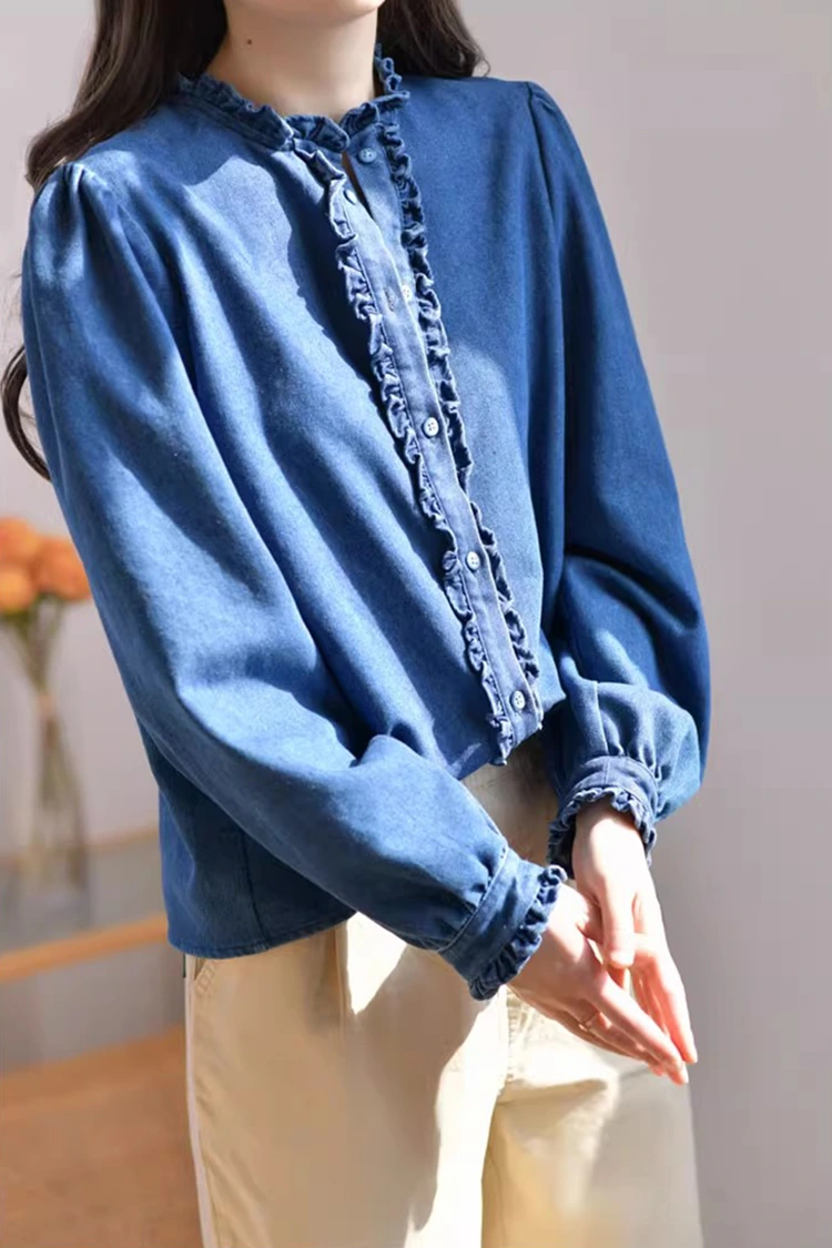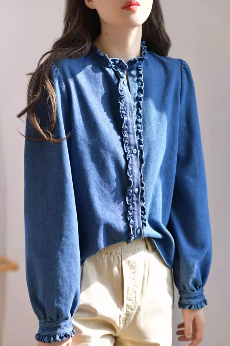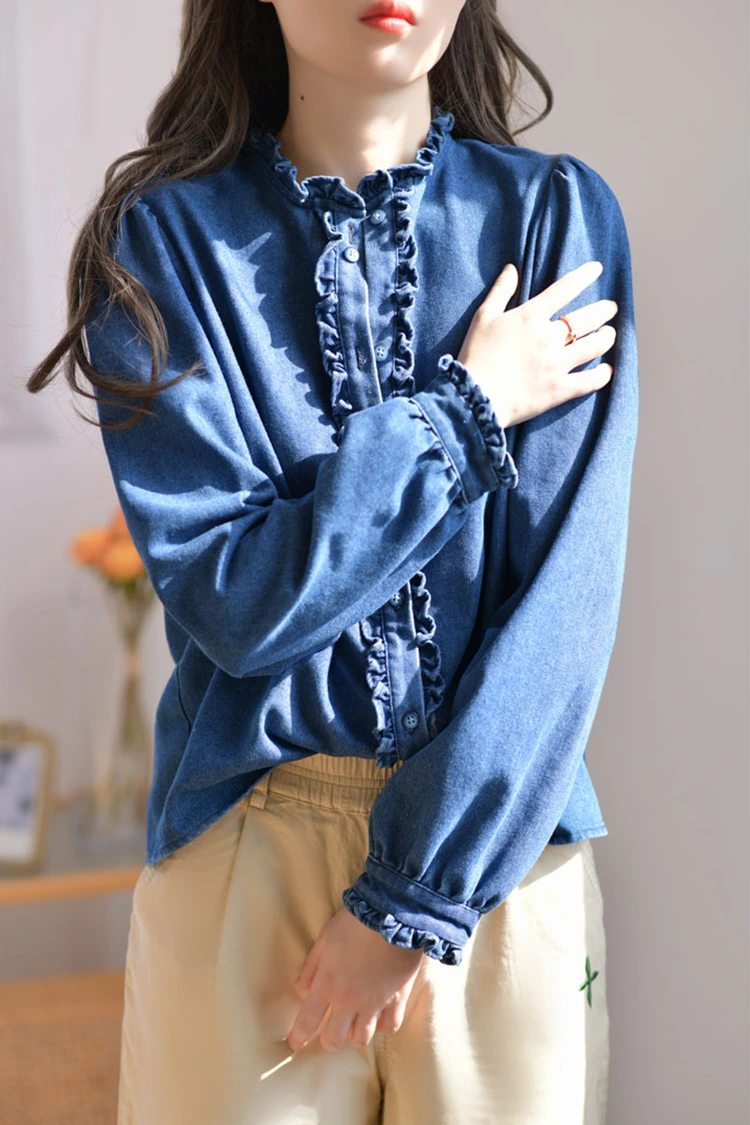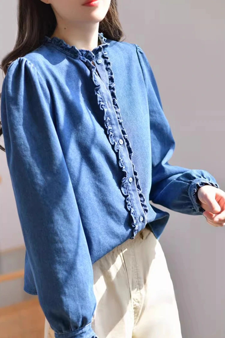Naisten farkkupusero on retro- ja rentokuvioinen, ja se sopii tarkasti naisten vartalon muotoon. Se ei riipu vartalotyypistä ja voi paitsi hioa hartioiden ja kaulan linjoja myös piilottaa ylimääräisen rasvan vyötäröltä ja vatsalta. Se täyttää eri vartalotyyppien tarpeet. Kaulus on suunniteltu pystykaulus, johon on yhdistetty hienoja röyhelteisiä reunoja. Etuaukko ja hihansuut on myös koristeltu herkillä röyhelöillä. Yhdessä pörröisten ja lyhdyn muotoisten pitkien hihojen kanssa se yhdistää täydellisesti retro-eleganssin ja rennon helppouden. Yksinkertainen yksivärinen kuvio on klassinen ja kestävä, eikä se mene pois muodista. Se voi luoda päivittäisen rennon ilmeen tai yksinkertaisen bisnestyylin, ja se on erittäin käytännöllinen.