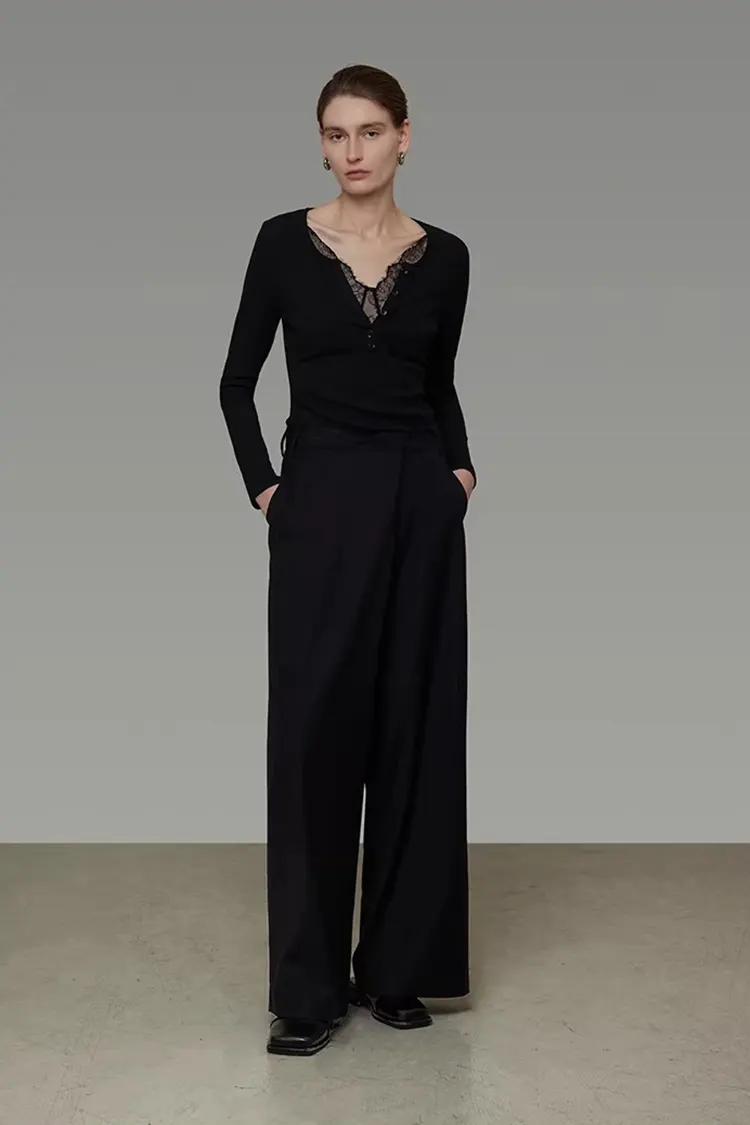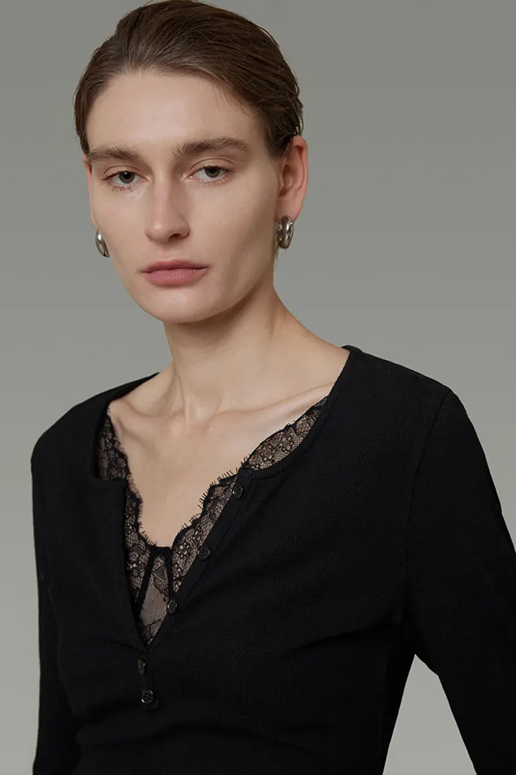 Naisten pitsissä V-kaula-aukkoisessa ohuessa puserossa on puoliavoin nappi, mikä helpottaa pukemista ja riisumista. Se mahdollistaa myös säädettävän kauluksen avauskoon, mikä vastaa erilaisiin pukeutumistarpeisiin. Yksinkertaiset napit sopivat vaatteen väriin, ja niissä on hienoja ja tukevia yksityiskohtia. Tämä ei vain lisää käytännöllisyyttä, vaan myös lisää syvyyttä yleisilmeeseen, mahdollistaen useiden asujen luomisen yhdestä vaatekappaleesta, mikä lisää merkittävästi loppukuluttajien käyttötiheyttä.