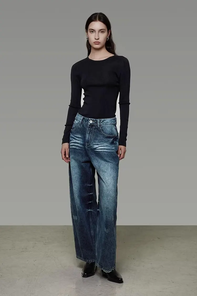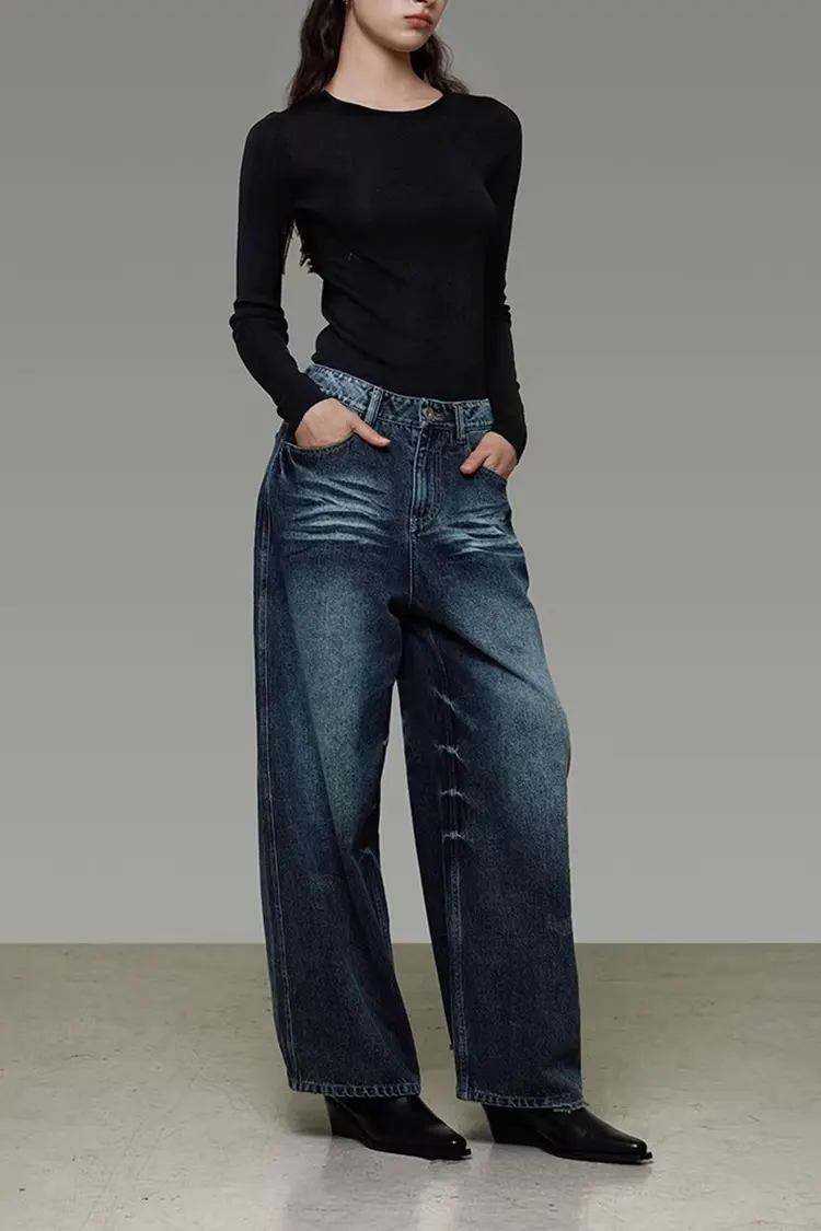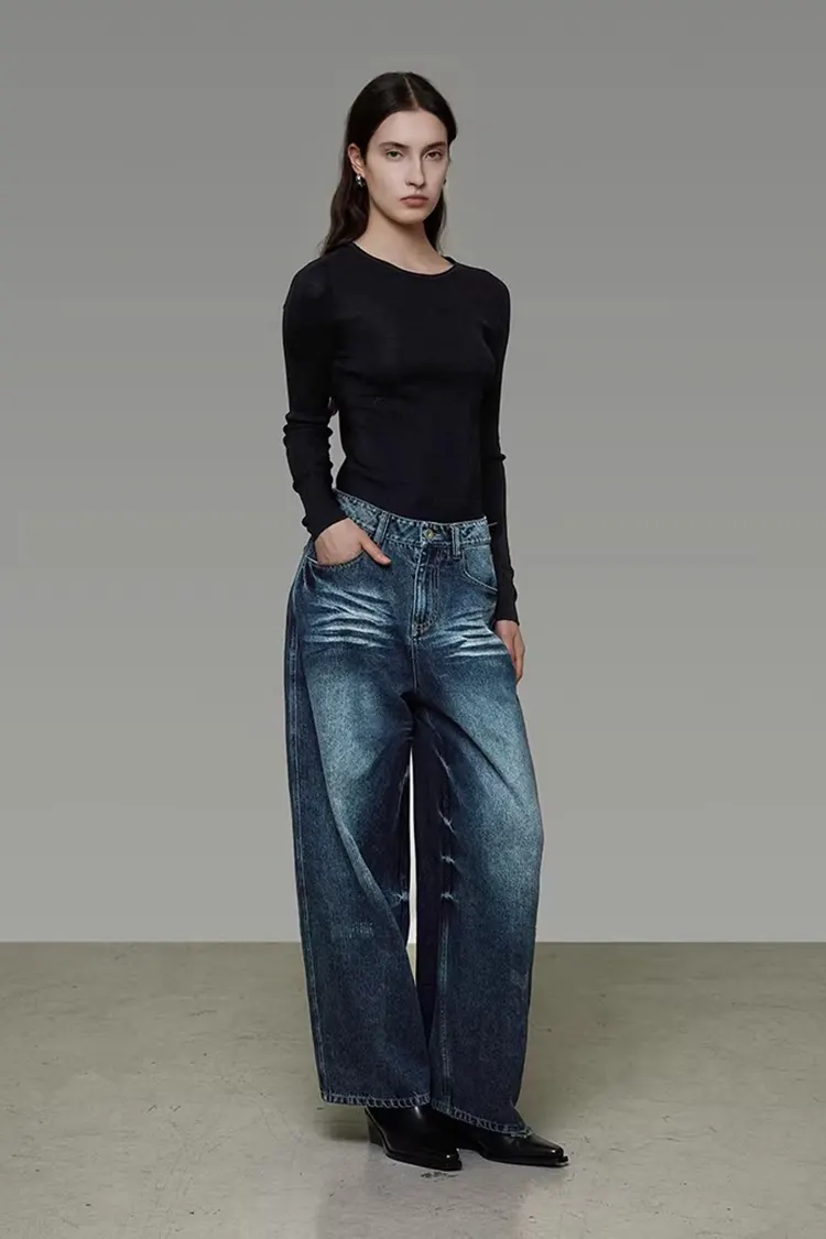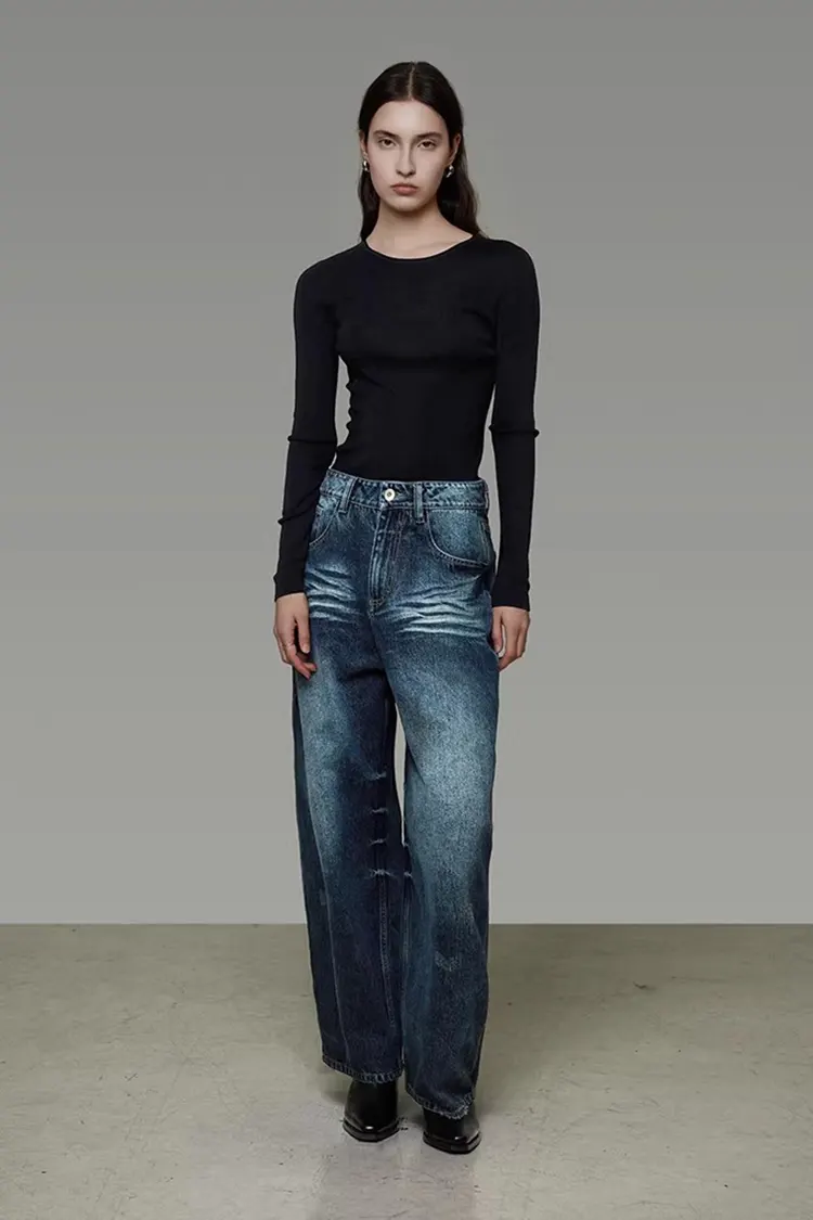 Naisten pestyt leveälahkeiset farkkuhousut tukevat värin, koon ja logon täyttä räätälöintiä. Niitä voidaan säätää asiakkaiden brändin sijainnin ja kohdemarkkinoiden mukaan. Minimitilausmäärä on 300 kappaletta ja toimitusaika 30-45 päivää. Ne voidaan lähettää Shanghaista ja suurista kotimaan satamista, ja logistiikkamenetelmiin, kuten merirahtiin ja pikatoimitukseen, on joustavia vaihtoehtoja. Koko prosessi konsultoinnista, näytteiden valmistuksesta, tuotannosta lähetykseen on yksi-yhteen palvelu. Näytemaksu voidaan palauttaa tilauksen tekemisen jälkeen.
